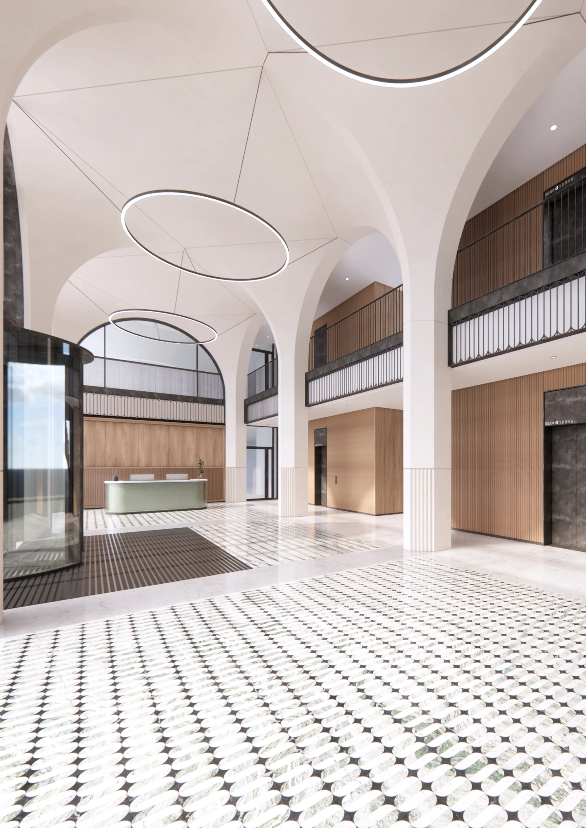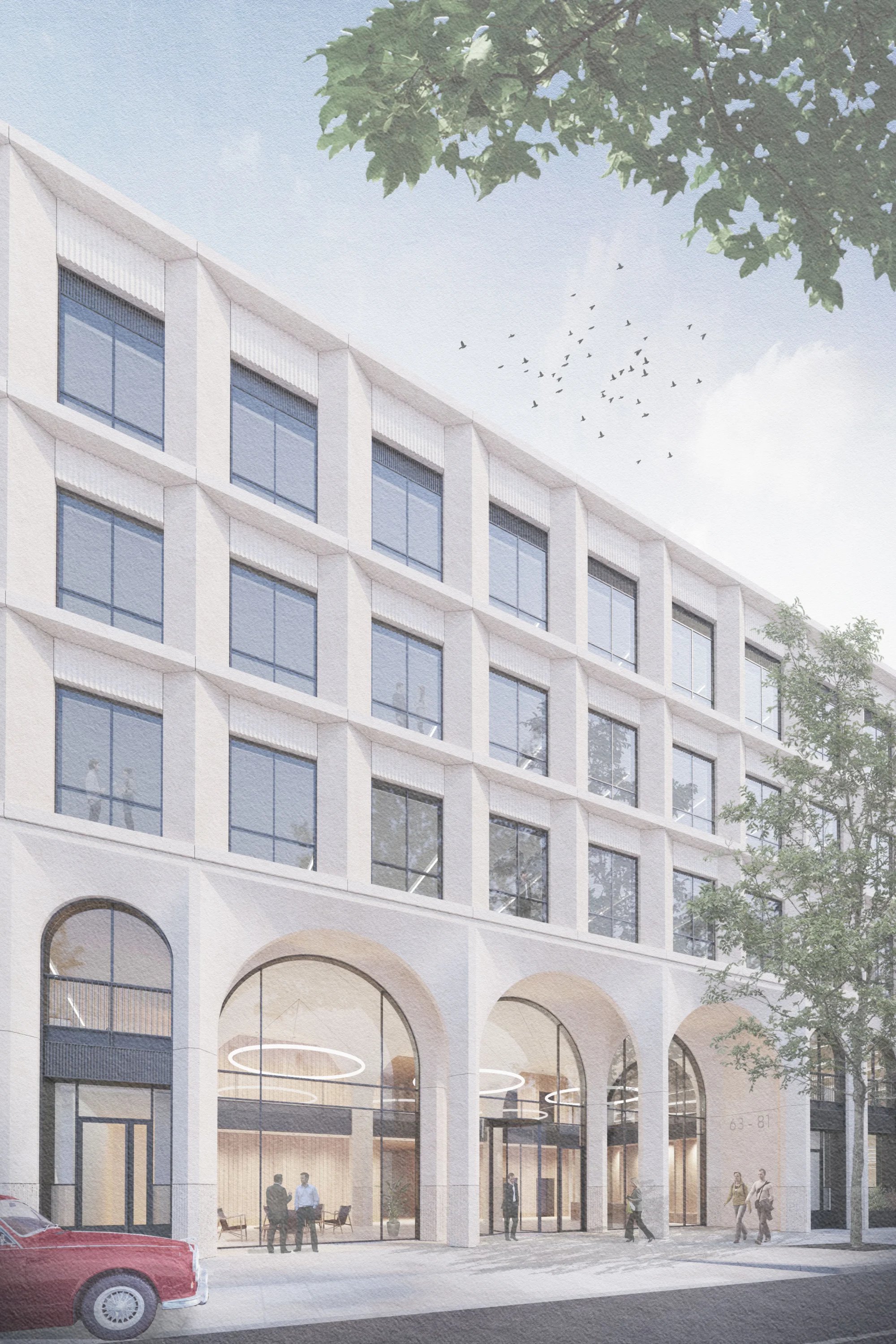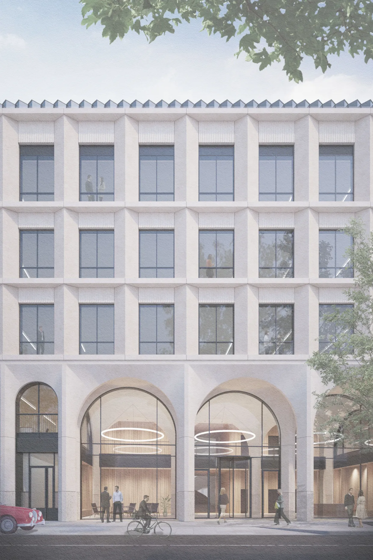 A simple rhythm of cast concrete pilasters frame arched openings along the Pelham Street frontage in a subtle reference to the surrounding architectural context. Variation in the scale of the arches articulate the key entrances to the building, which are further emphasised through recessed porticos. The proposals also widen the pavement, and incorporate new street planters and trees to improve pedestrian experience along Pelham Street.